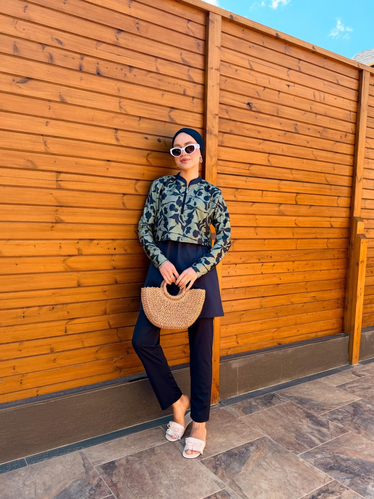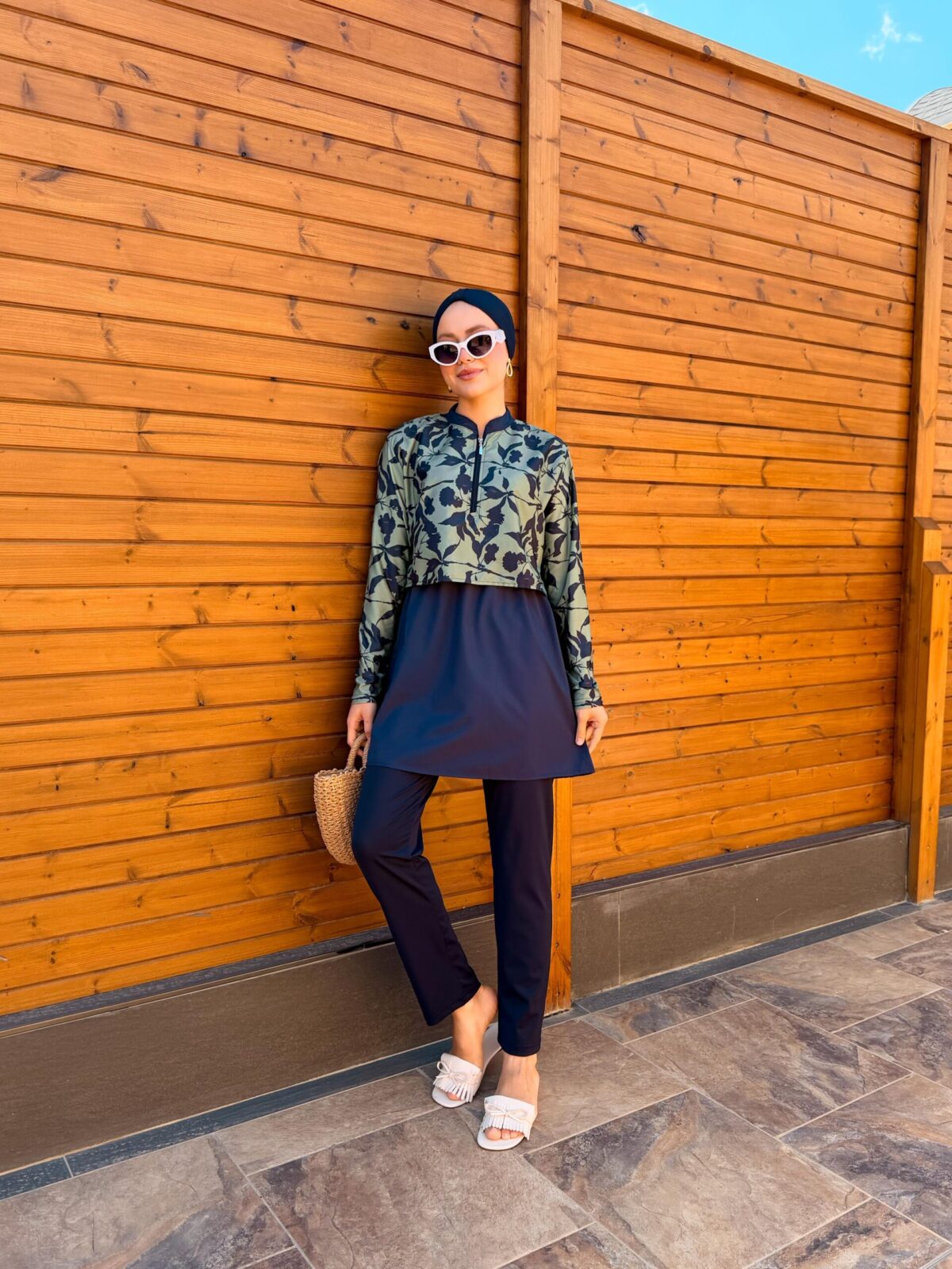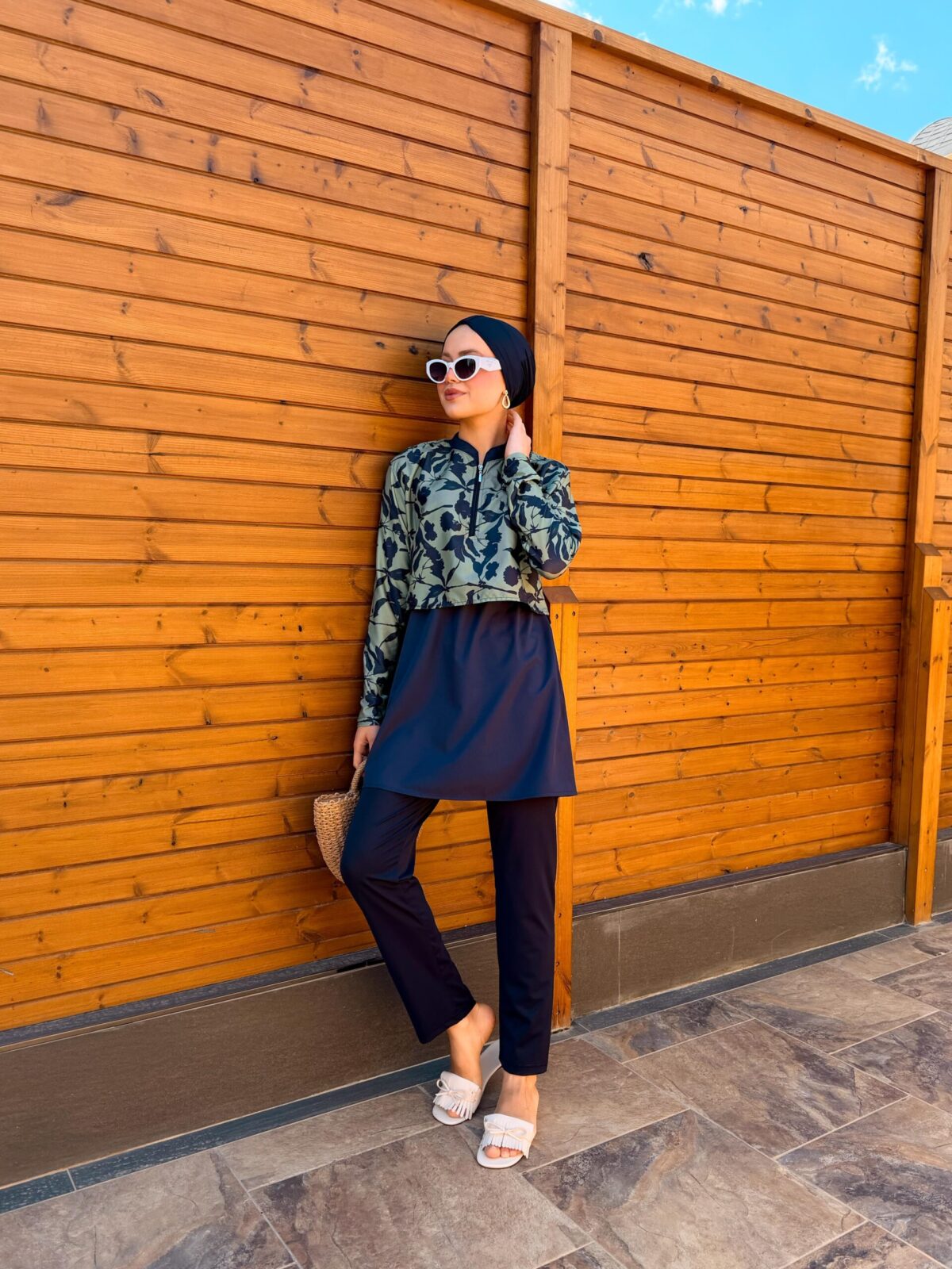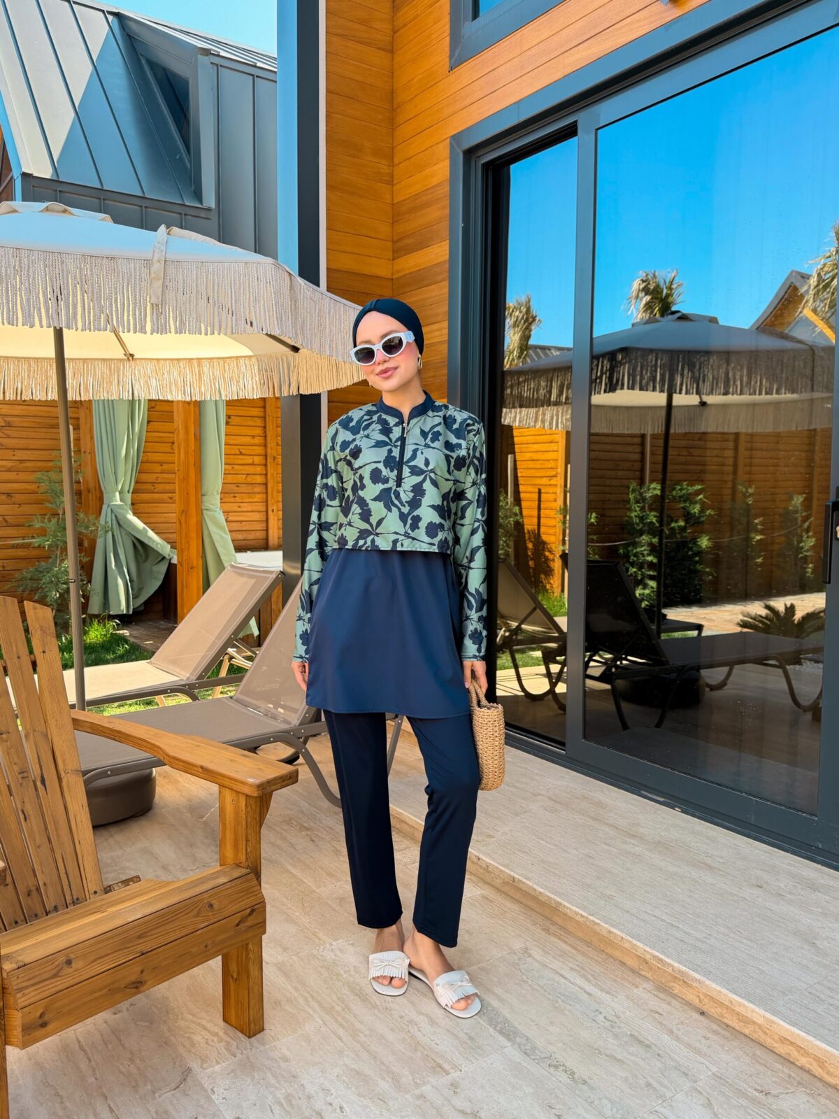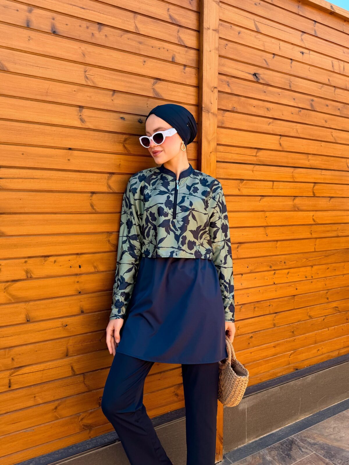 PARAŞÜT KUMAŞ TESETTÜR MAYO UZUN - LACİVERT YAPRAK DESEN