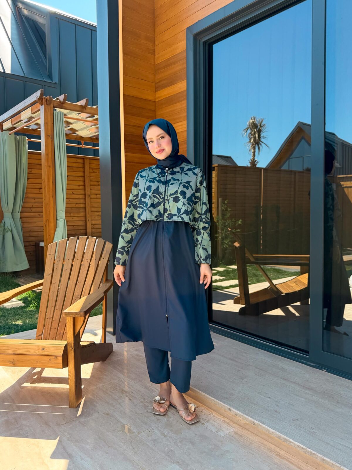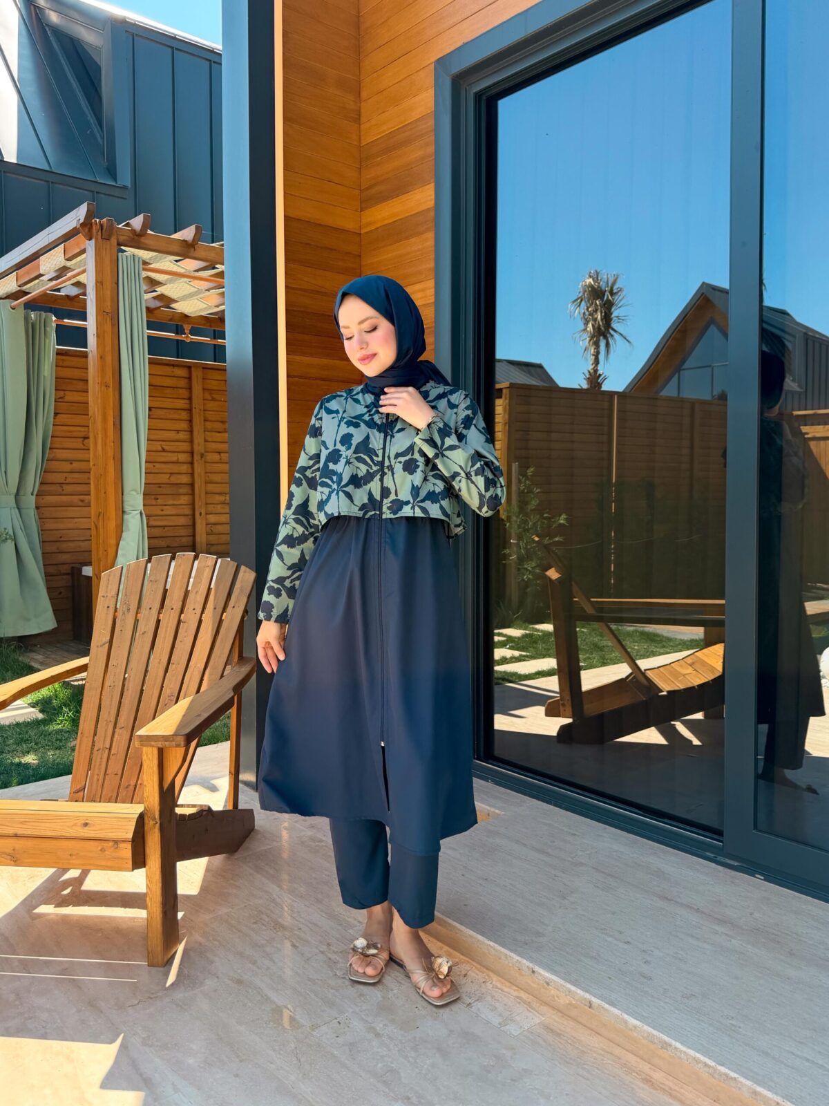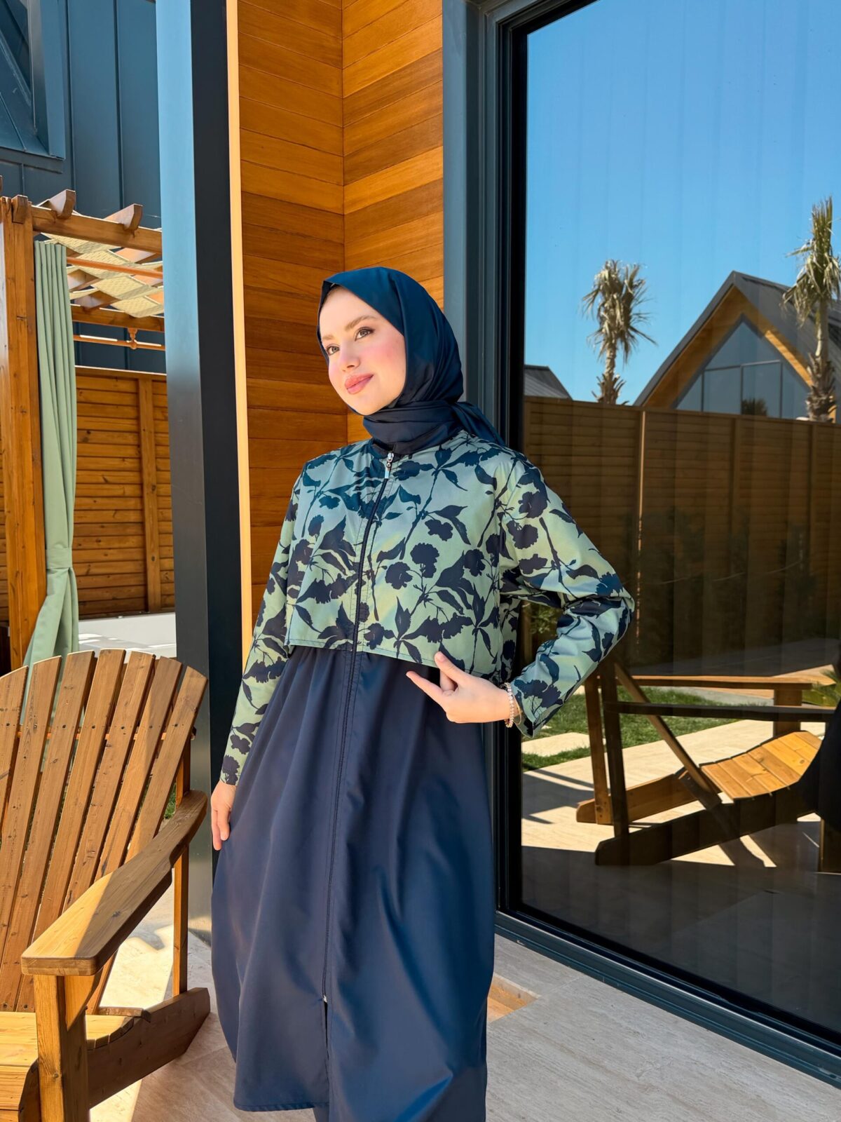 PARAŞÜT KUMAŞ TESETTÜR MAYO UZUN – LACİVERT YAPRAK DESEN