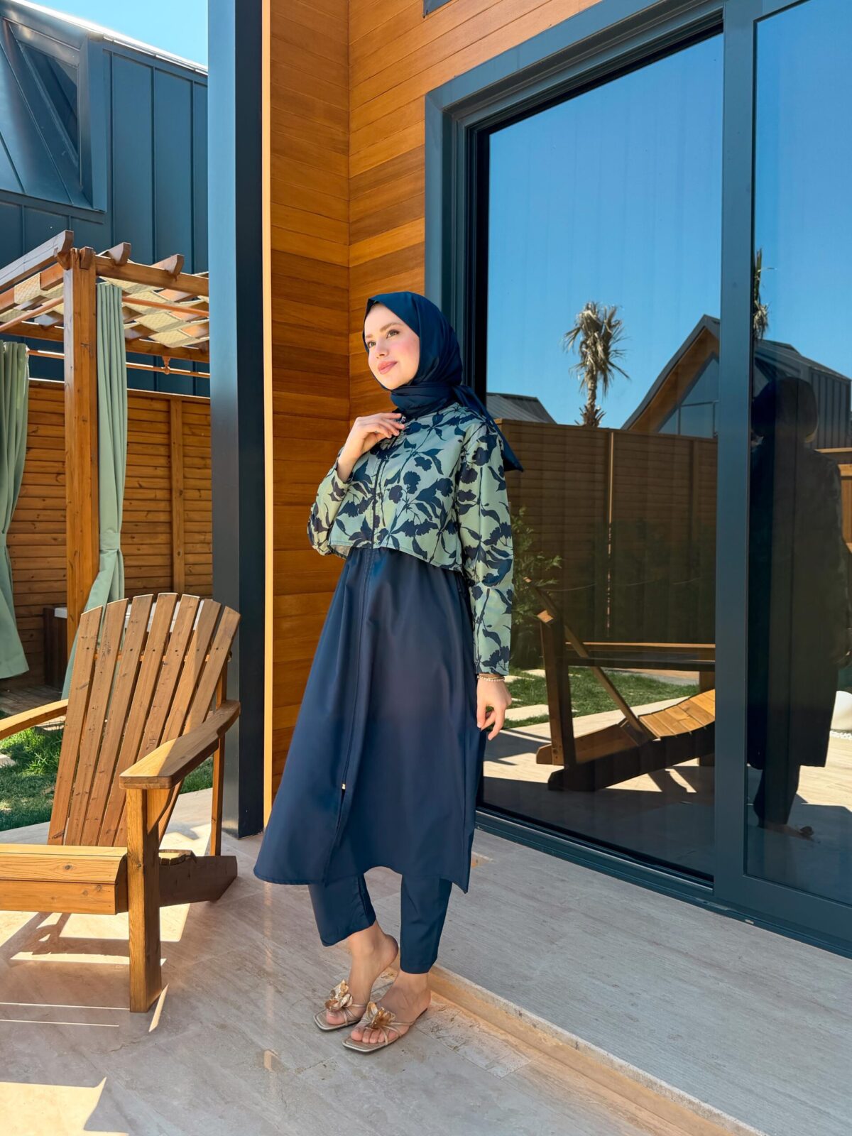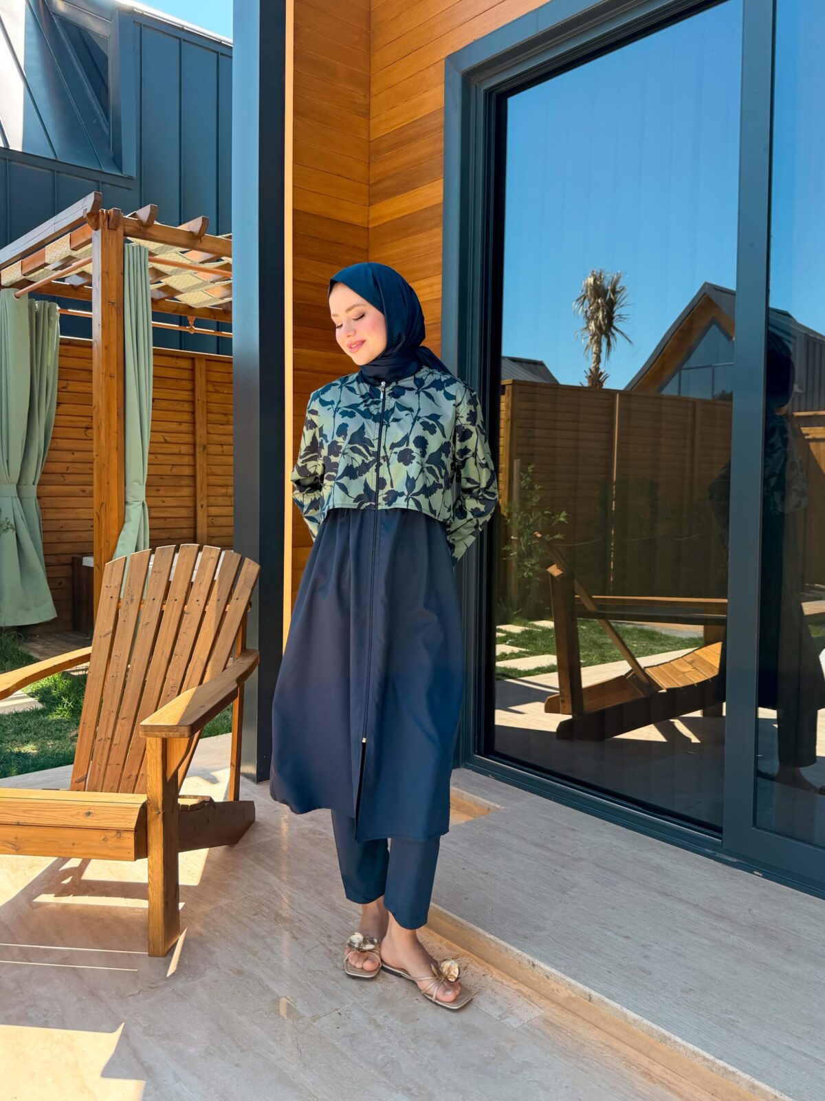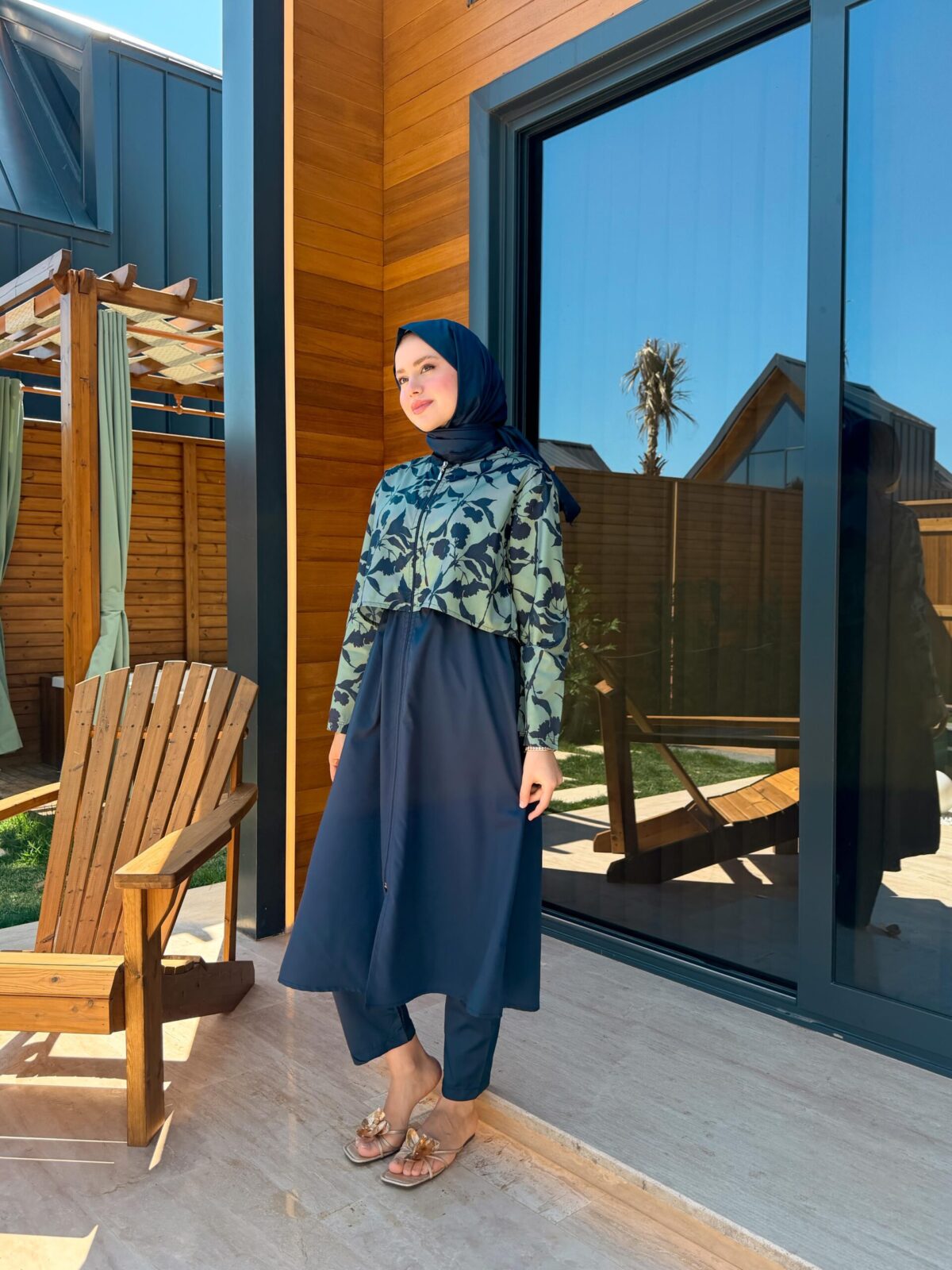 PARAŞÜT KUMAŞ TESETTÜR MAYO UZUN – LACİVERT YAPRAK DESEN
